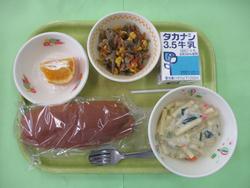 今日のメニューは、はいがパン、チリコン大根、じゃがいものソテー、牛乳・チーズです。