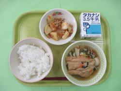今日のメニューは、麦ごはん、さばのみぞれあんかけ、けんちんじる、焼きのり、牛乳です。
