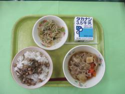 今日のメニューは、ごはん、秋味ごはんの具、きんぴら、かきたまじる、牛乳です。