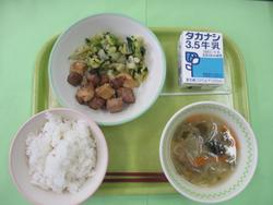 今日のメニューは、ごはん、あげぎょうざ、ゆで野菜、タンタンスープ、牛乳です。