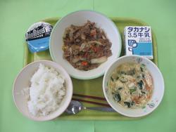 今日のメニューは、麦ごはん、かつおのごまみそあえ、けんちんじる、牛乳です。