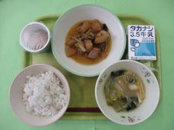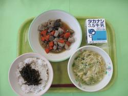 今日のメニューは、ごはん、魚のから揚げ、ひじきごはんの具、けんちんじる、牛乳です。