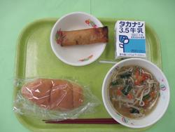 今日のメニューは、ロールパン、春巻、サンマーめん、牛乳です。