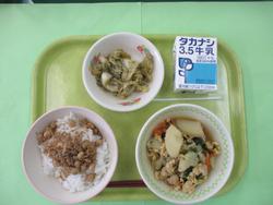 今日のメニューは、麦ごはん、ぶりだいこん、みそ汁、納豆、牛乳です。