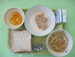 今日のメニューは、食パン、ツナペースト、ヌードルスープ、ミックスフルーツ、牛乳です。