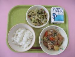 今日のメニューは、ごはん、肉じゃが、からしじょうゆあえ、牛乳です。