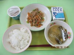 今日のメニューは、ごはん、牛乳、豚肉と切干だいこんの煮物、みそ汁、納豆です。