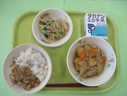 今日のメニューは、麦ごはん、肉じゃが、からしじょうゆあえ、だいずとじゃこの炒り煮、牛乳です。