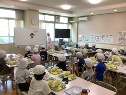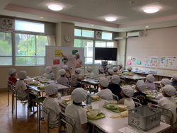 食べる前には、栄養教諭から「バランスの良い食事」についてのお話を聞き、食べ物の働きやバランスよく食べる大切さを学びました。いつもとは違う環境で楽しく学びながら給食を食べました。