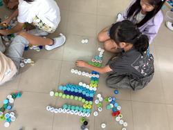 ペットボトルキャップやカプラ、プラカップなどを並べたり積んだりしました。