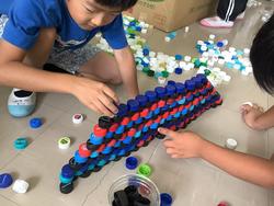 ペットボトルキャップやカプラ、プラカップなどを並べたり積んだりしました。