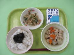 今日のメニューは、麦ごはん、ふくめに、ごまじょうゆあえ、のりのつくだに、牛乳です。