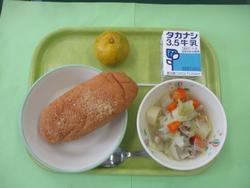 今日のメニューは、あげパン、野菜のスープに、みかん、牛乳です。