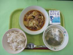 今日のメニューは、はいがごはん、タッカルビ、はるさめスープ、牛乳です。
