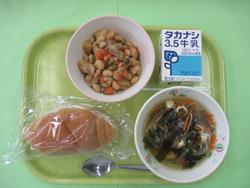 今日のメニューは、ロールパン、変わり五目豆、わかめスープ、牛乳です。