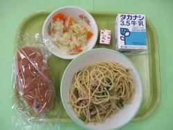 今日のメニューは、ぶどうパン、ツナとこまつなのスパゲティ、ホットマリネ、牛乳・チーズです。