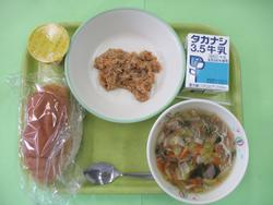 今日のメニューは、ロールパン、ツナペースト、肉団子とはくさいのスープ、牛乳、ラフランスゼリーです。