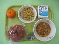 今日のメニューは、はいがパン、カレービーンズシチュー、野菜ソテー、みかん、牛乳です。
