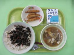 今日のメニューは、はいがごはん、きびなごフライ、ひじきごはんの具、けんちんじる、牛乳です。