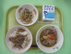 今日のメニューは、はいがごはん、肉じゃが、にびたし、だいずとじゃこの炒り煮、牛乳です。