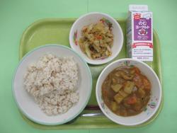 今日のメニューは、はいがごはん、ポークカレー、ごまずあえ、プルーンはっこう乳です。