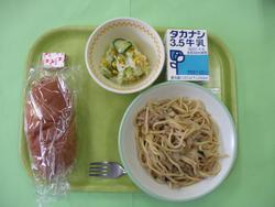 今日のメニューは、ぶどうパン、きのこスパゲティ、コーンサラダ、牛乳・チーズです。