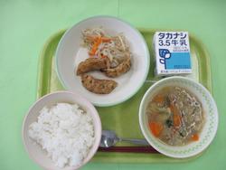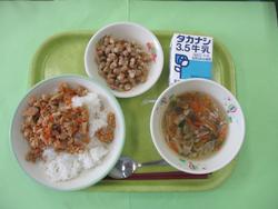 今日のメニューは、ごはん、ツナそぼろ、揚げだいず、沢にわん、牛乳です。