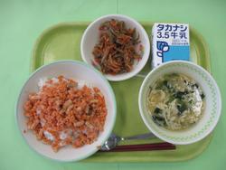 今日のメニューは、ごはん、秋味ごはんの具、きんぴら、かきたまじる、牛乳です。