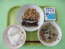 今日のメニューは、ごはん、煮魚、揚げだいず、ぶたじる、牛乳です。