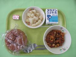 今日のメニューは、はいがパン、チリコン大根、じゃがいものソテー、牛乳・チーズです。