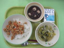 今日のメニューは、ごはん、ツナそぼろ、みそしる、白玉ぜんざい、牛乳です。