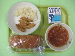 今日のメニューは、ぶどうパン、いりこフライ、こふきいも、ミネストローネ、牛乳です。