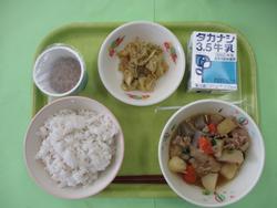 今日のメニューは、はいがごはん、和風カレー、ごまずあえ、プルーンはっこう乳です。