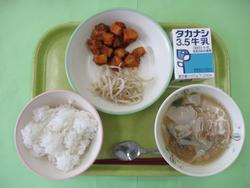 今日のメニューは、ごはん、麻婆豆腐、中華あえ、牛乳です。