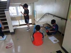また、図工の授業では「ここから見ると」(造形遊び)の学習をしました。校舎内の壁などに色紙等を貼り、特定の場所から見ると何かの形に見えるような工夫をして、見る人を楽しませるような活動です。