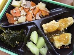 中学校給食の献立は、これまでの小学校給食の経験をいかして、横浜市の栄養士が議論を重ねながら作っています。今日の献立は、「ごはん、豚肉とじゃが芋の煮物、揚げだし豆腐、りんごの甘煮、わかめともやしのキムチ和え、ごぼうと水菜のみそ汁」でした。