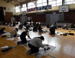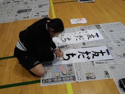 また、3年生から6年生は、体育館の床一面に新聞紙を広げ、長半紙に毛筆で書きました。