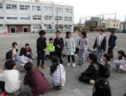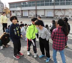 子どもたちは、焼きいもが出来上がるまで、学年で実行委員が考えたレクリエーションをしました。まず、「伝言ゲーム」です。各クラスで列をつくり、先頭の子から順に、お題の言葉を伝えていきます。途中で、少しずつ言葉が変わってしまい、最後の子に全然違う言葉が伝わったときは、大笑いしていました。