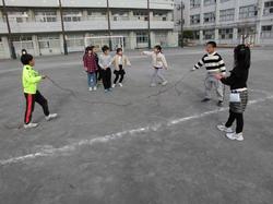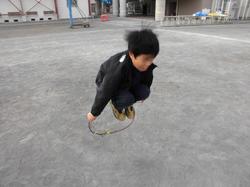 次に、収穫したさつまいものつるで、縄跳びをしました。一人で跳ぶ子もいれば、つるをつなげて長縄のようにして、大勢で跳ぶ子たちもいました。普通の縄と違って、跳ぶのが難しそうでしたが、初めての体験を楽しんでいました。