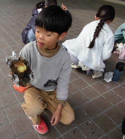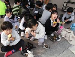 そして、いよいよ、出来上がった焼きいもを食べる時間です。さつまいもを包んだ新聞紙やアルミホイルを丁寧に剝がし、「あたたかいね。」「甘くておいしいよ。」と言いながら、友達と一緒に、一口一口味わいながら食べていました。
