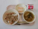 今日の給食の献立は、牛乳、むぎごはん、ツナそぼろ、白玉雑煮、なますでした。