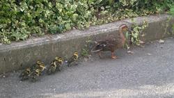 そして、夏休み直前の7月18日の金曜日の夕方、母ガモがひな8羽を連れてお引越しを始めました。先生たちと地元の人、警察の方で協力し、3時間かかってみんな無事に遊水池へ渡りました。小さな命の冒険に、心がいっぱいになった日でした。
