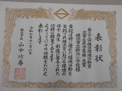 日々取り組んでいる新治小学校の豊かな自然を活用した学習活動が評価され、この度、横浜環境活動賞の「大賞」を受賞しました。11月10日朝会にてみどり環境局の方から児童代表の6年生に賞状が授与されました。これからも、自然と関わり、大切にできる子どもたちの育成を進めていきます。(11月10日)