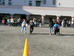 ペアで協力しながら新聞紙にボールをのせて、コーンをまわります。ダッシュで走り抜ける息の合ったペアもいれば、途中でボールを落としてしまい、笑いが止まらないペアもいました。ペアで仲が深まった集会になりました。
