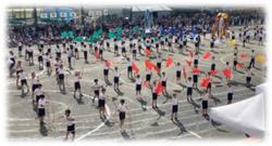 3・4年生の競技である「台風の目」は、中学年の運動会スローガン「心をつなげ 3・4年! ~笑顔・チャレンジ・真剣・チーム力~」をテーマに取り組みました。子どもたちは、この目標に向かって元気に競技を行いました。
