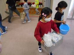 給食の片づけも当番で行っています。教室で集めてきた食器や牛乳パックと食缶を給食室に戻します。おかずの入った食缶を所定の位置に置いたり、プラスチックと燃やすごみ、残食となっているパンやご飯を分けて捨てたりします。週が替わると当番が替わるだけでなく、「牛乳から大きなおかず」など役割も替わります。3か月ほどたってようやく役割が一回りします。全員がやりたいことに取り組めるまでにはなかなか時間がかかります。