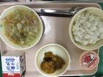麦ごはん 牛乳 チキンライスの具 野菜スープ りんご