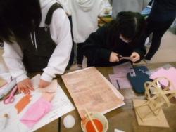 6年生が材料を組み合わせて、LEDライトの点灯を利用しての、すてきな光を感じるランプシェードを作成していました。竹ひごや針金、風船を使って骨組みを作り、色を付けた和紙を貼っていきます。色のついた和紙を貼る中で、自分のイメージに合うかどうかを廊下に出て、暗い中で点灯して試していました。「色がまだ薄いからイメージに合わない」と貼る予定だった和紙に重ねて色を付けて、イメージに近づけていました。小学校での最後の立体作品になりますが、どの子も自分の思いに向けて取り組んでいる様子が見られました。