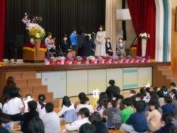 離任・退任式が引き続いて行われました。今年度で異動する職員とのお別れです。今年度は8人の職員が異動します。最後は花道を通ってさよならをしました。卒業生もたくさん駆けつけてくれました。