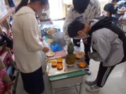 13日の給食では卒業と進級を祝う赤飯が全校に出ました。次の日の14日には6年生だけに「おめでとう給食」が出ました。チキンと豆腐ハンバーグから1つ選び、フルーツも2種類選ぶことができます。その日のメニューは人気のビビンバだったので、6年生はおなか一杯になっていました。パイナップルやオレンジの皮も盛り付けに使われていて、うれしそうに眺めていました。